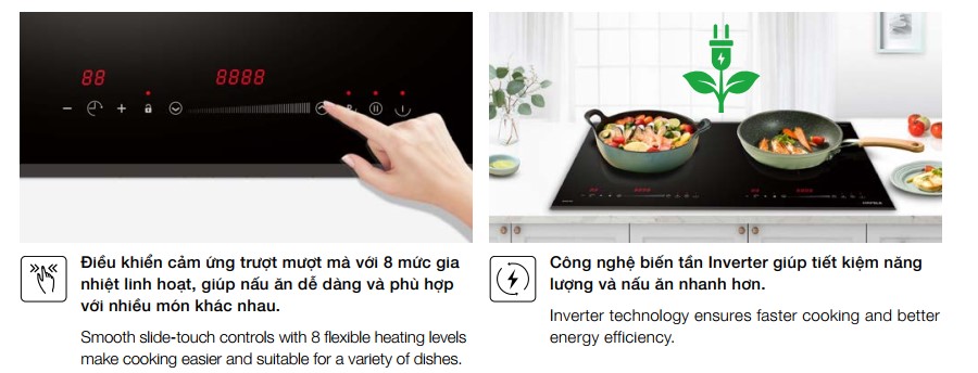 Với hai vùng nấu độc lập, bảng điều khiển cảm ứng trượt cực nhạy và công nghệ Inverter tiên tiến, sản phẩm mang đến hiệu suất nấu ăn vượt trội nhưng vẫn giữ được sự tinh gọn trong vận hành – một lựa chọn đáng cân nhắc cho căn bếp gia đình Việt theo phong cách châu Âu.