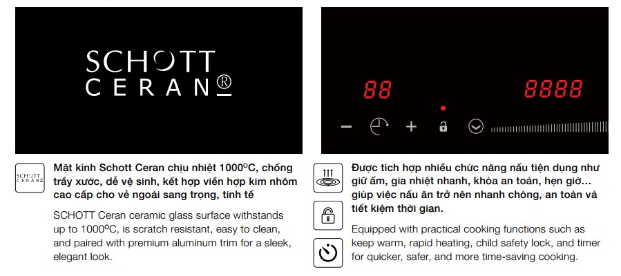Lớp kính Schott Ceran cao cấp phủ toàn bề mặt mang lại độ bền cao, chịu sốc nhiệt lên đến 1000°C, hạn chế trầy xước và đổi màu sau thời gian dài sử dụng.