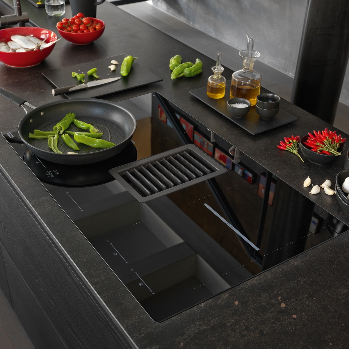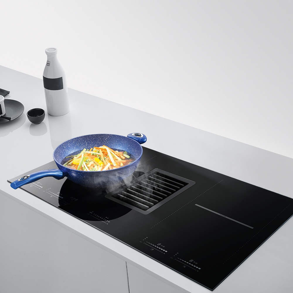 Sản phẩm sở hữu thiết kế tối giản với mặt kính đen kết hợp thép không gỉ sang trọng, đồng thời tích hợp hệ thống hút mùi ngay trên mặt bếp. Giải pháp này giúp loại bỏ mùi và khói ngay tại nguồn, không cần lắp máy hút treo, đặc biệt phù hợp với bếp đảo hoặc không gian mở.
