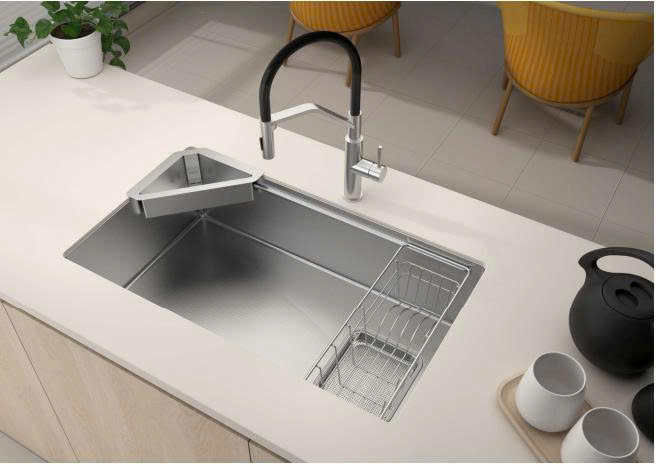 Tương thích phụ kiện: Thiết kế gờ chậu thông minh cho phép tích hợp vừa vặn các phụ kiện như: Chậu mini, thớt gỗ, Rollmat. Bạn có thể rửa rau, thái thịt và làm ráo nước ngay trên mặt chậu mà không làm ướt bàn bếp.