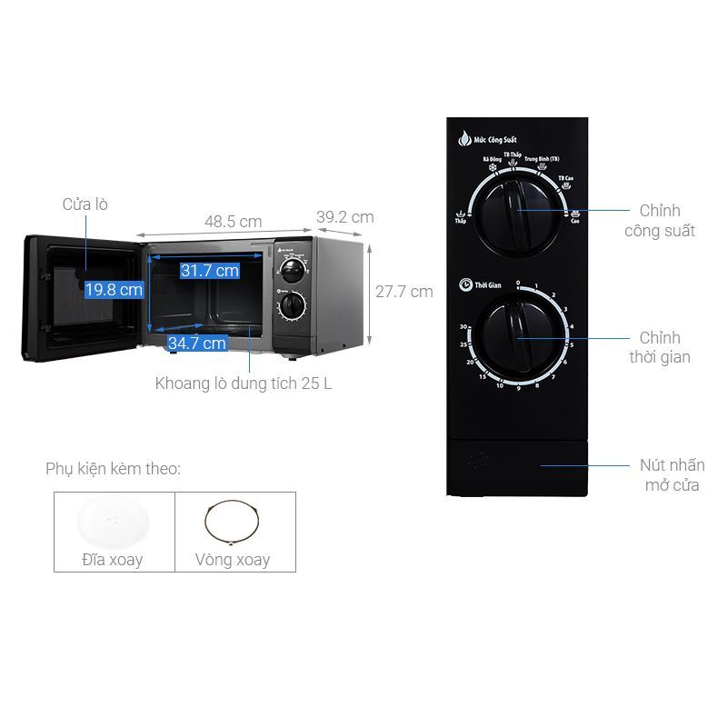 Thiết kế nhỏ gọn, tiết kiệm không gian: Lò vi sóng có kích thước gọn gàng, dễ dàng bố trí ở nhiều vị trí trong căn bếp, đặc biệt phù hợp với không gian vừa và nhỏ. Dung tích 25 lít đáp ứng tốt nhu cầu nấu nướng, hâm nóng thường ngày của gia đình.