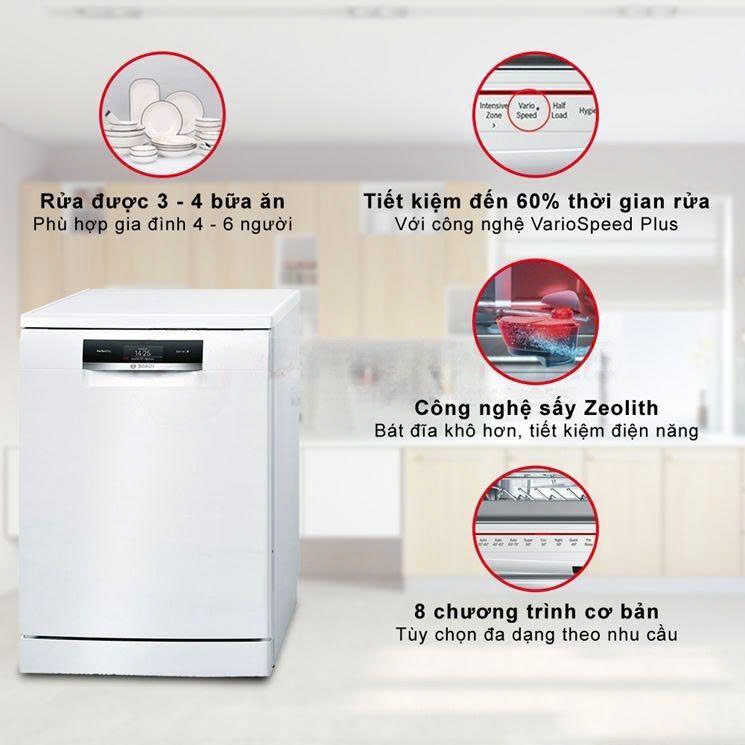 Máy rửa bát Bosch độc lập SMS88TW02M có khả năng rửa tới 14 bộ đồ ăn Châu Âu, tương đương với khoảng 3-4 mâm cơm Việt (gia đình 4-6 người).