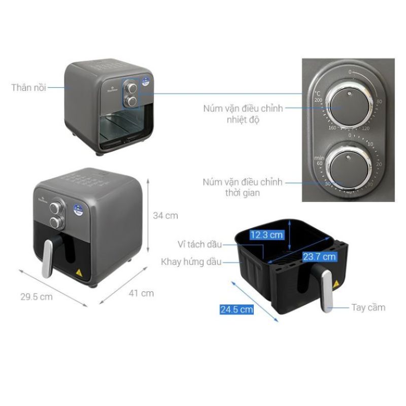 Điều khiển cơ linh hoạt – Dễ sử dụng: Nồi được trang bị 2 núm vặn điều chỉnh nhiệt độ (80–200°C) và thời gian hẹn giờ lên đến 60 phút, cho phép bạn chủ động tùy chỉnh theo từng loại món ăn. Thiết kế thân thiện, phù hợp với mọi lứa tuổi.