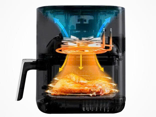Dòng nhiệt lốc xoáy 360°: Luồng khí nóng luân chuyển tốc độ cao giúp thực phẩm chín đều từ trong ra ngoài, tạo độ giòn tan bề mặt nhưng vẫn giữ được độ ẩm bên trong.