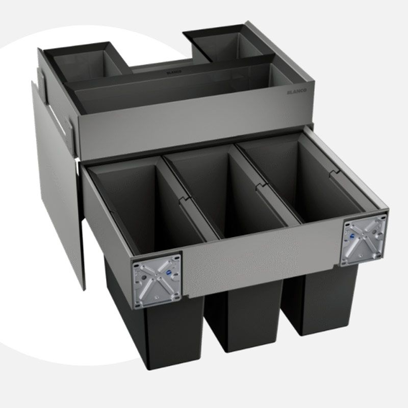 Thùng rác Blanco Select 60/3 Orga 518726 — giải pháp phân loại rác tinh tế với 3 ngăn 15 lít, thiết kế âm tủ hiện đại, ray trượt giảm chấn, khung thép và thùng nhựa cao cấp, mang lại sự gọn gàng, sang trọng và tiện ích cho không gian bếp của bạn.