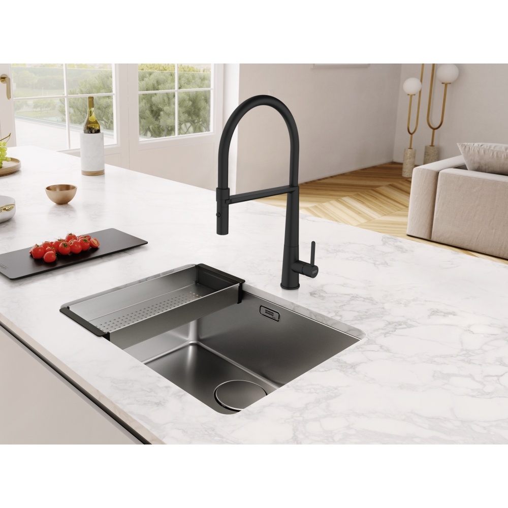 Vòi rửa bát FRANKE Icon Semi-Pro Side HP là mẫu vòi cao cấp thuộc dòng Mythos, nổi bật với thiết kế bán chuyên (semi-professional) mạnh mẽ, hiện đại cùng gam màu đen mờ cá tính. Sản phẩm không chỉ mang lại hiệu năng sử dụng linh hoạt mà còn tạo điểm nhấn ấn tượng cho không gian bếp đương đại.