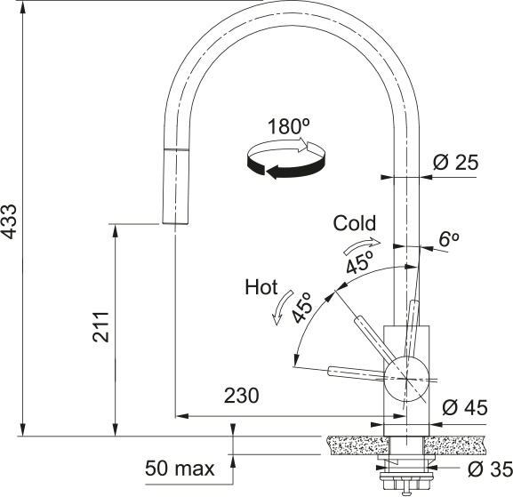 Vòi sở hữu dáng J cao 433 mm, giúp tạo khoảng trống rộng rãi bên dưới, thuận tiện khi rửa nồi lớn, chảo sâu hoặc thao tác sơ chế thực phẩm. Kiểu dáng thanh thoát cũng giúp không gian bếp trở nên hiện đại và tinh tế hơn.