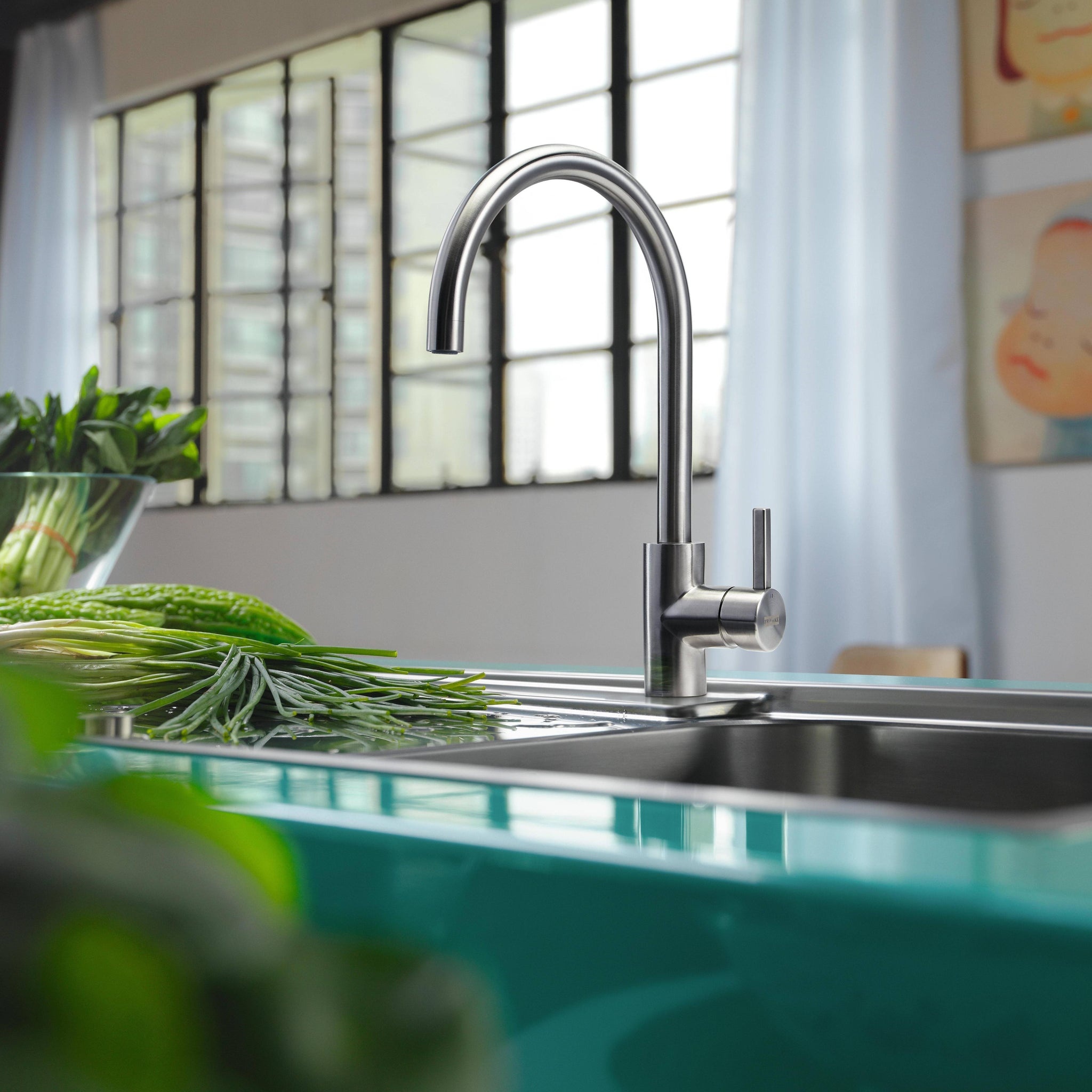 Kiểu dáng chữ J với chiều cao lý tưởng giúp tạo khoảng không rộng rãi dưới vòi, thuận tiện khi rửa xoong nồi lớn hoặc sơ chế thực phẩm.